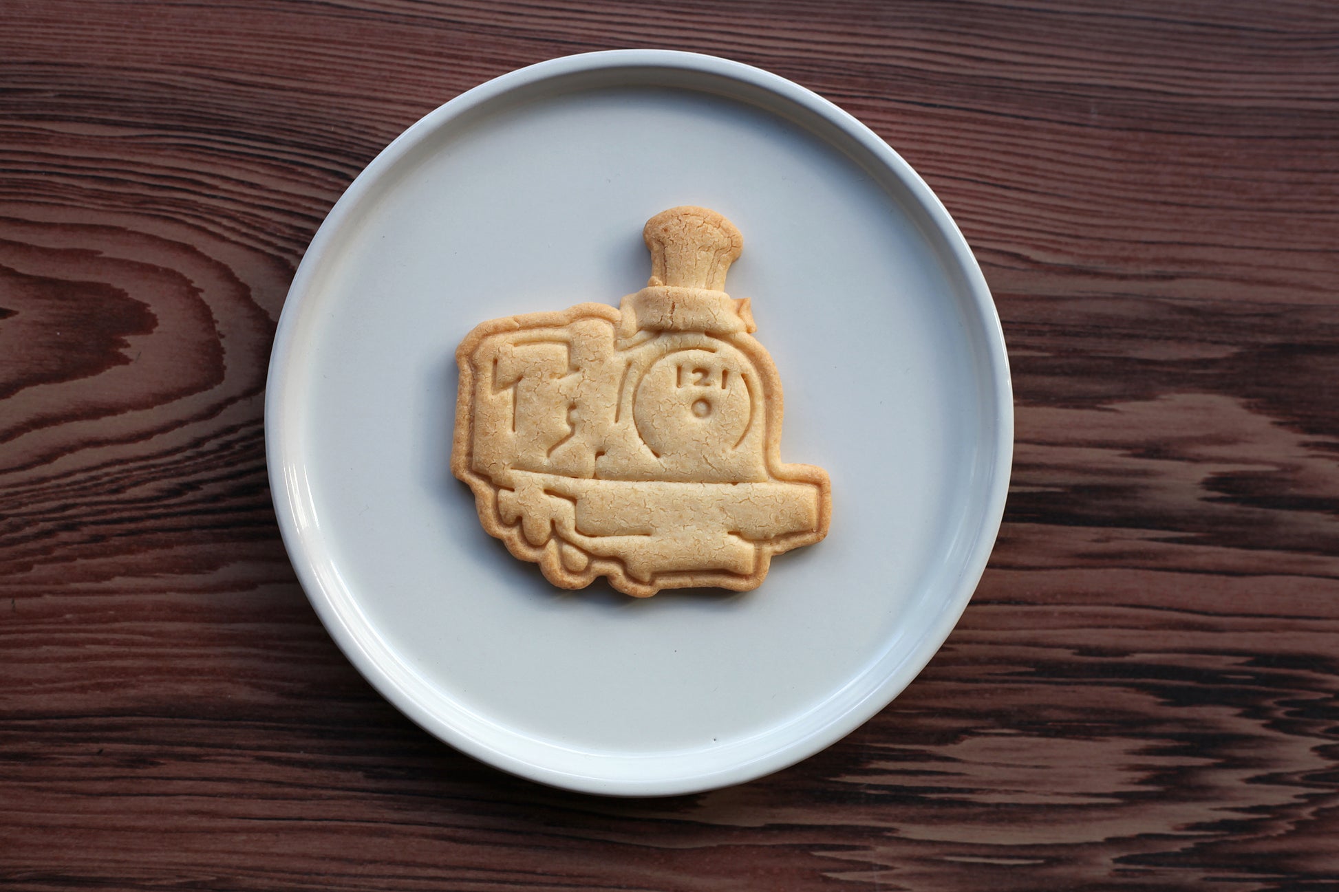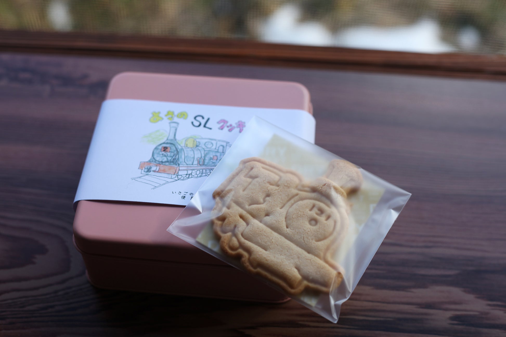 与謝野町の旧加悦鉄道で活躍した2号機関車をモチーフにした米粉のSLクッキー。町民が愛着を持つ車両のデザインを、与謝野町・道の駅の駅長考案し、キッチンいさごが商品化。グルテンフリーの米粉や、きび砂糖を使うなど、なるべく身体にやさしい材料で作っています。