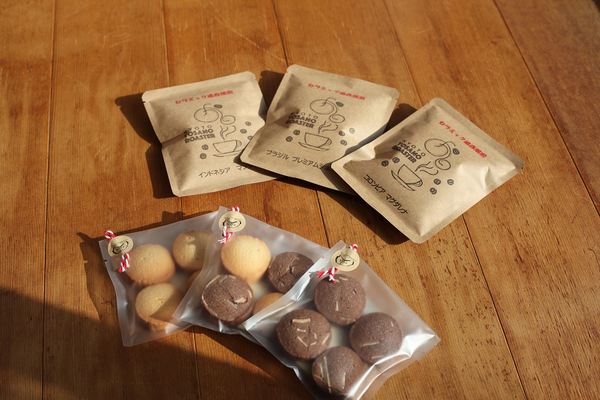 「米粉のおやつ パッセの米粉のクッキー」と「YOSANO ROASTER KYOTOさんのドリップパック」のセット。クッキーと珈琲は相性抜群!