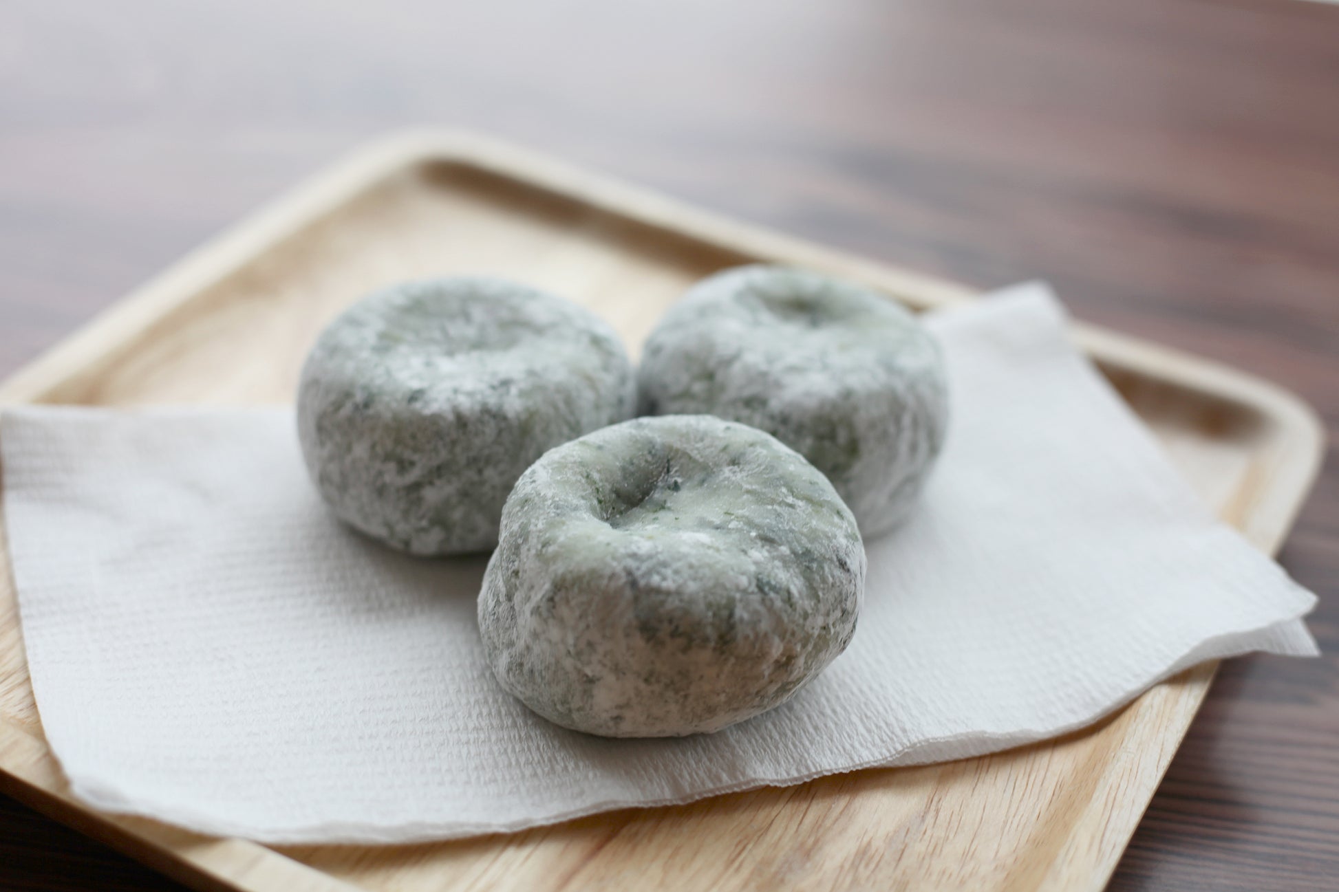 地元産と但馬産のもち米と、地元の春よもぎの若芽のみを使用しています。1年間で使用するよもぎをすべて春の短期間で手摘みし、お餅の製造も全て手作り。甘さ控えめの上品な自家製粒あんと香り高いよもぎの相性は抜群です。是非ご賞味ください。